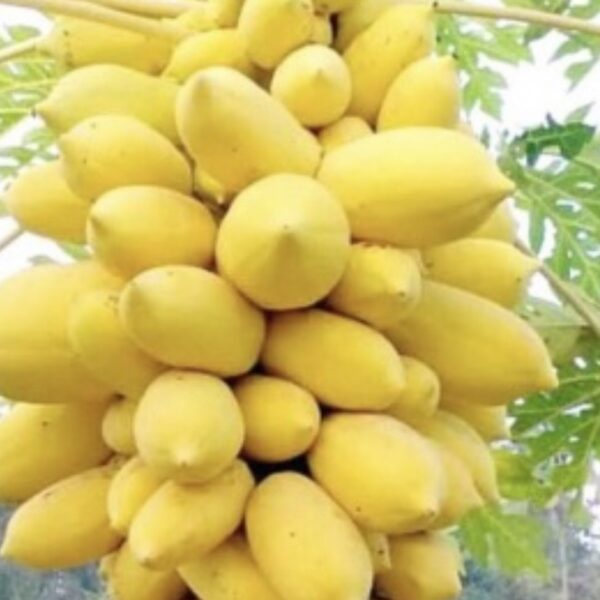 - Quả Đu Đủ Vàng có hình bầu dục, hơi thon dài, vỏ mỏng màu vàng cam khi chín. Thịt quả màu vàng cam, mềm, mịn, có vị ngọt thanh và mùi thơm đặc trưng. Hạt Đu Đủ Vàng nhỏ, màu đen, nằm ở trung tâm quả.