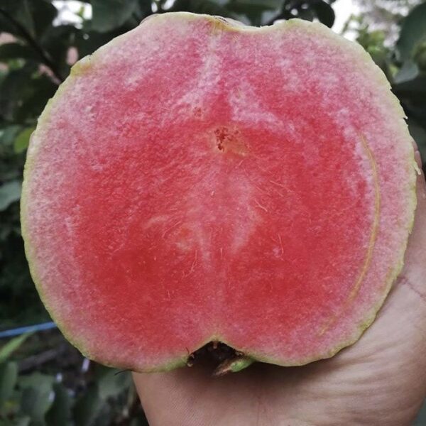 - Quả: Quả ổi Ruby ruột đỏ có hình dạng tròn hoặc hơi dẹt, đường kính khoảng 4-6 cm. Vỏ quả mỏng, màu xanh sáng, khi chín chuyển sang màu xanh vàng. Thịt quả màu đỏ đậm, giòn, ngọt và ít hạt. Quả ổi Ruby ruột đỏ chứa nhiều vitamin C, chất xơ và các khoáng chất tốt cho sức khỏe.